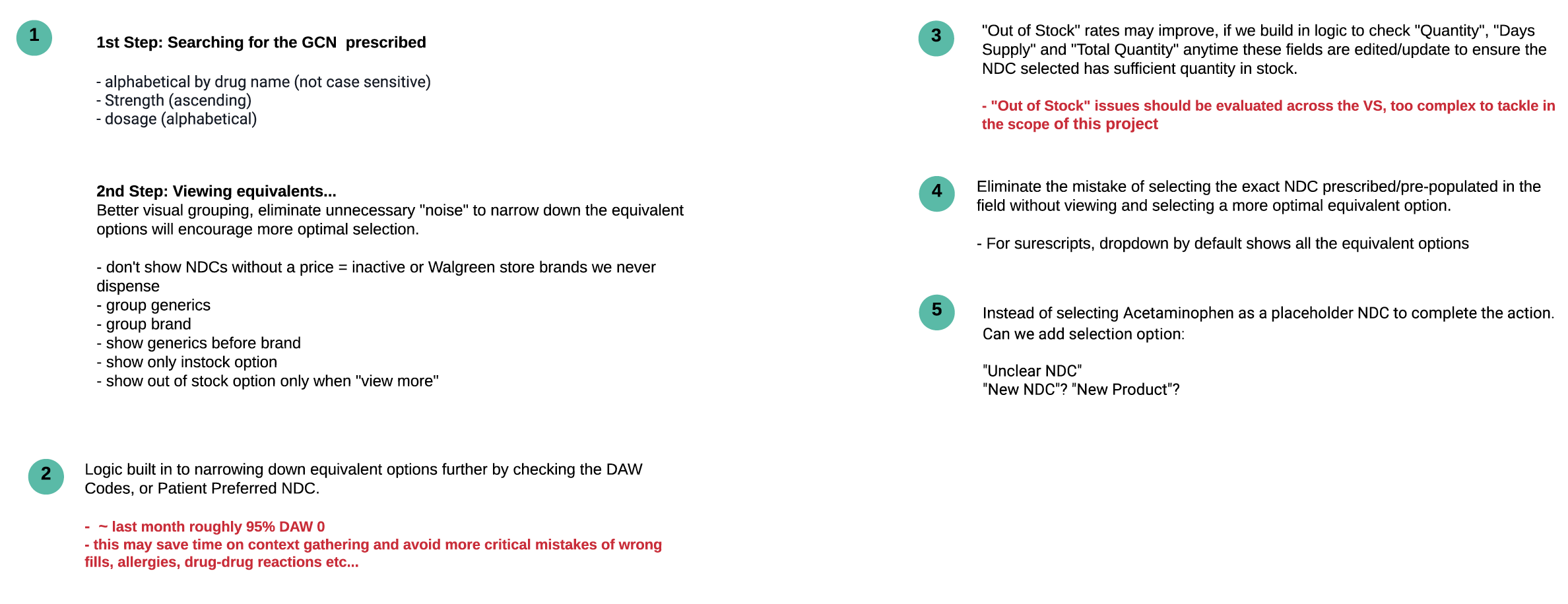 I then deconstructed the steps in the drug search to understand user’s mental model and decision points at each given interaction. I wanted to classify which drug information is primary and what is secondary. I also wanted to identify If any information leads to users taking other actions or initiate additional workflows outside of the task of intake.